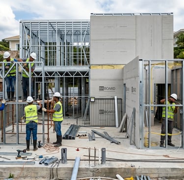 Sistema construtivo em Stilframe e fechamento em Drywall, desenvolvendo uma obra limpa, leve e com velocidade na execução. Este sistema construtivo favorece economia de materiais, dinâmica no processo de execução e acabamento perfeito, pois todo o projeto segue uma equalização de montagem com hidraulicas, elétricas, arrefecimento e fechamento.